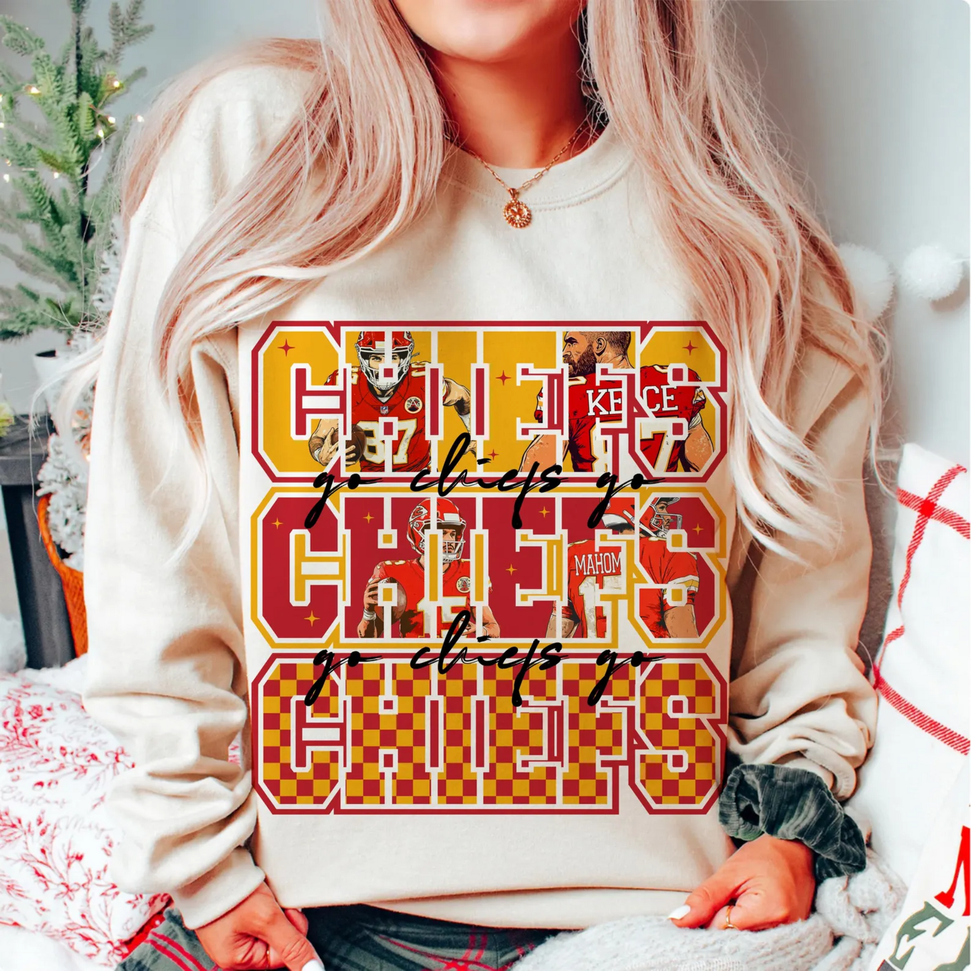 Get game-day ready with this bold and stylishΒ football fan design! Featuring stacked lettering with player graphics and vibrant red and gold accents, this tee or crewneck is perfect for showing your pride all season long.