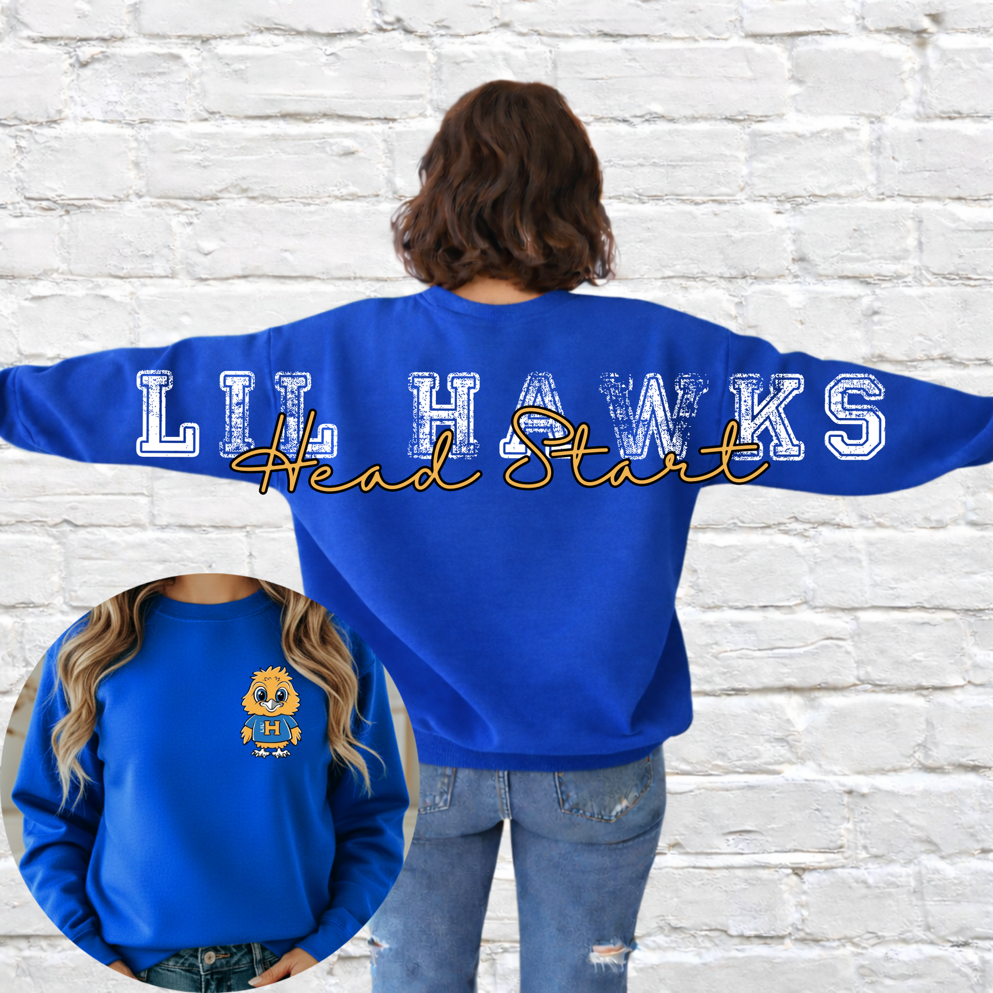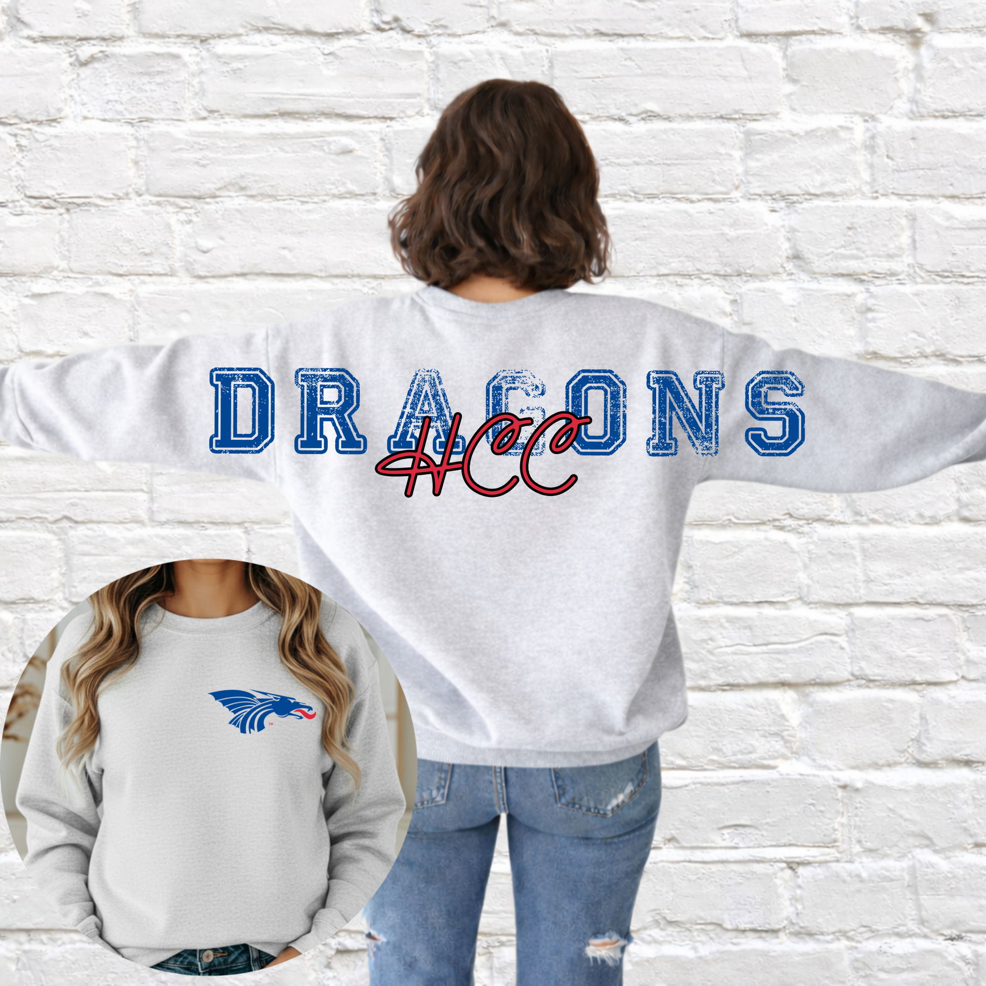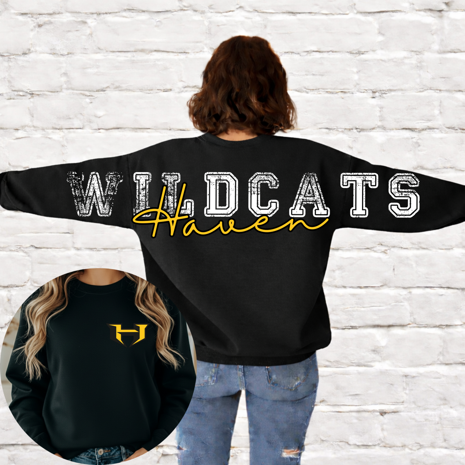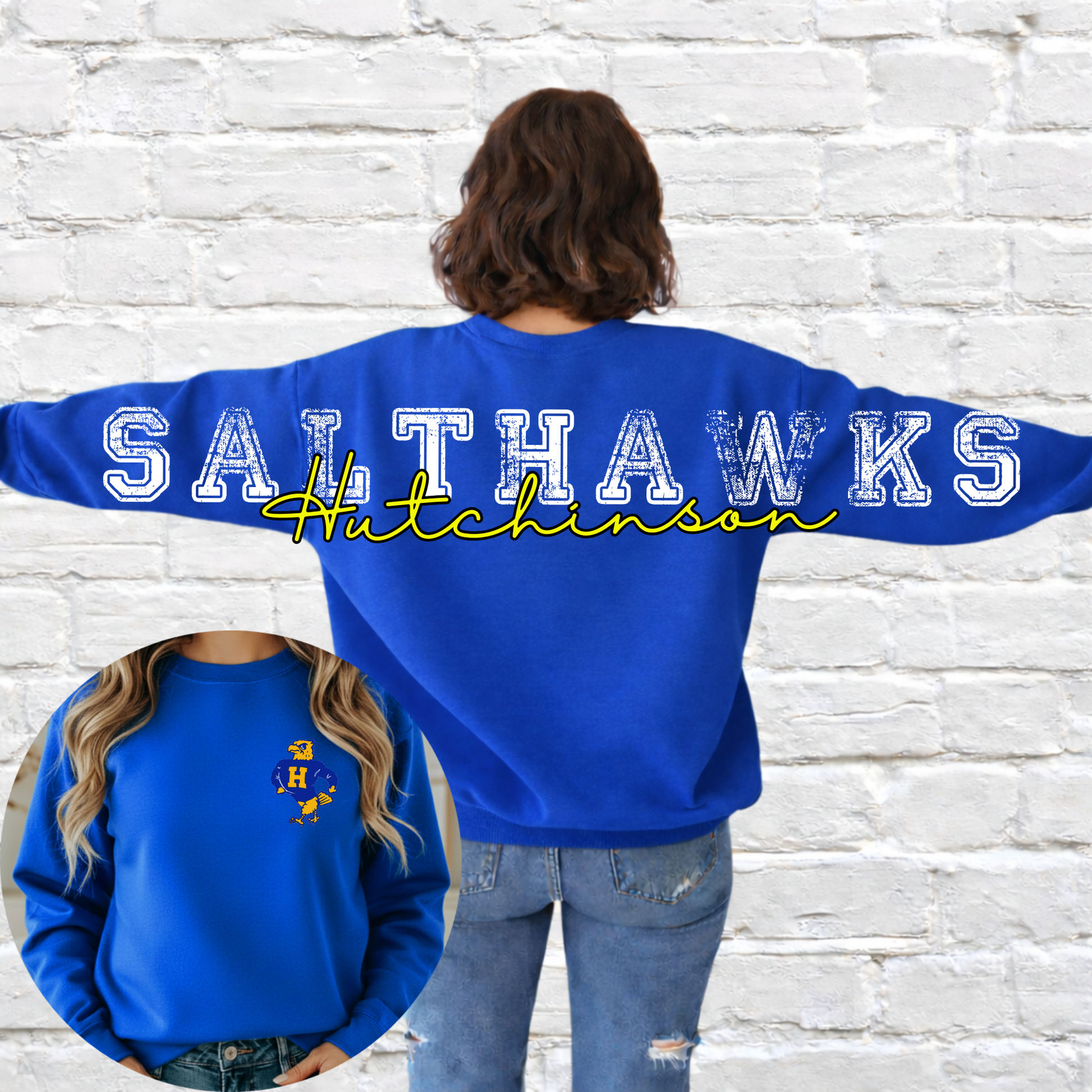 Show up and show out for your team in this bold back statement crewneck! Featuring a large distressed mascot name across the back with your school name layered in script, this sweatshirt makes the perfect statement for game days, pep rallies, or everyday school spirit.